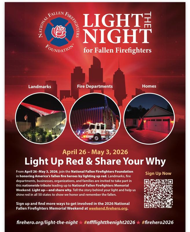 "Light the Night" will precede the National Fallen Firefighters Memorial Weekend, scheduled for May 2-3, 2026, in Emmitsburg, MD.